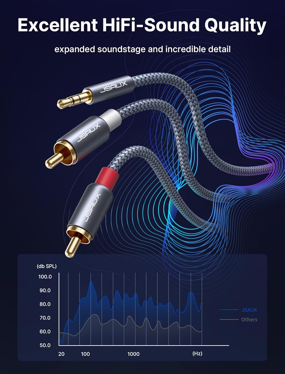 Experience crystal-clear sound with the JSAUX RCA to 3.5mm Audio Cable (6.6ft). This high-quality adapter is designed to deliver premium stereo audio from your smartphone, tablet, or laptop to your amplifier, speaker, or TV.